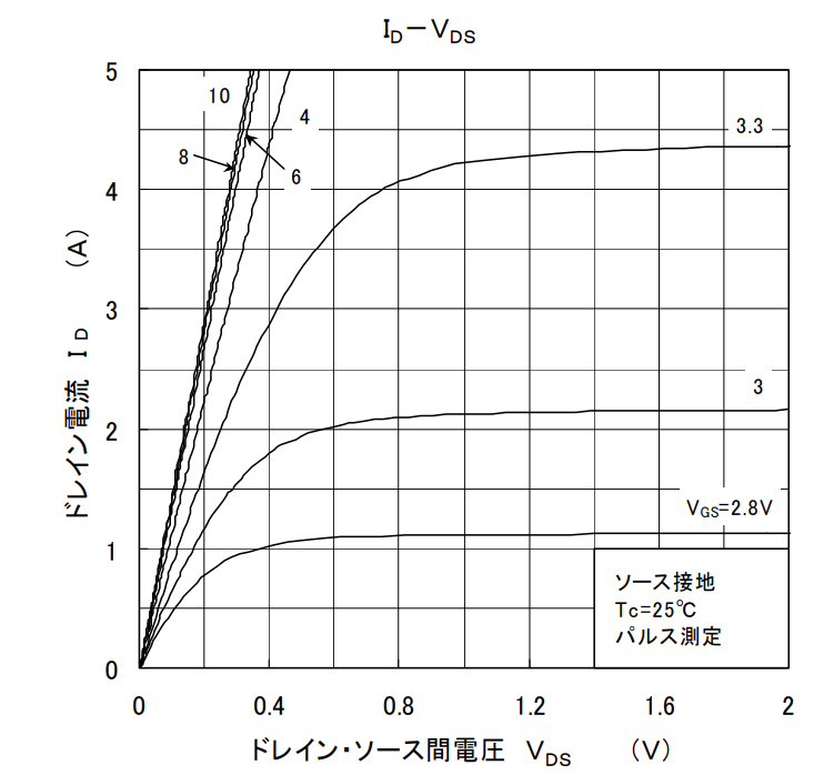 この状況の例として失敗した2SK4017のデータシートを見てみる.確かに3.3Vでは電圧が高くても電流が流れにくいことが確認できる.これに加え電圧印加から実際にゲートが開くまでのタイムラグがある.だからPWMのように高周波でゲートに負荷してもこのようなmofsetでは流れなかったと考察してる.
