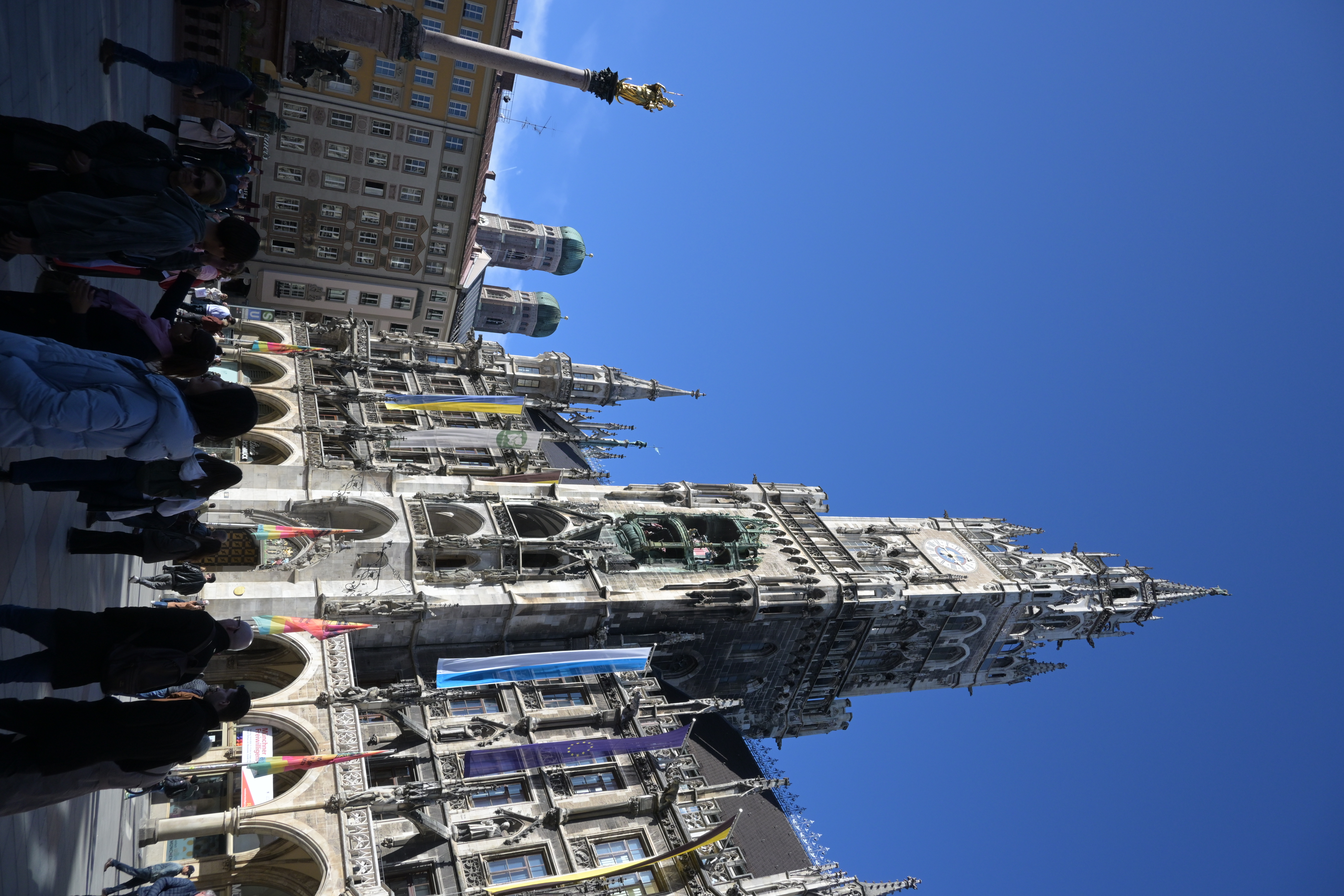 ミュンヘンレジデンツに向かうと前日にご飯を食べたあたりに来た.鐘の音が鳴っていた建物.マリエン広場(Marienplatz)らしい.マリエンプラッツという単語は何回も聞いたので重要な場所だろう.この時計台は新市庁舎で撮影スポットになっている.この辺りは町の中心のようで,百貨店やバイエルンミュンヘンのショップもあった.