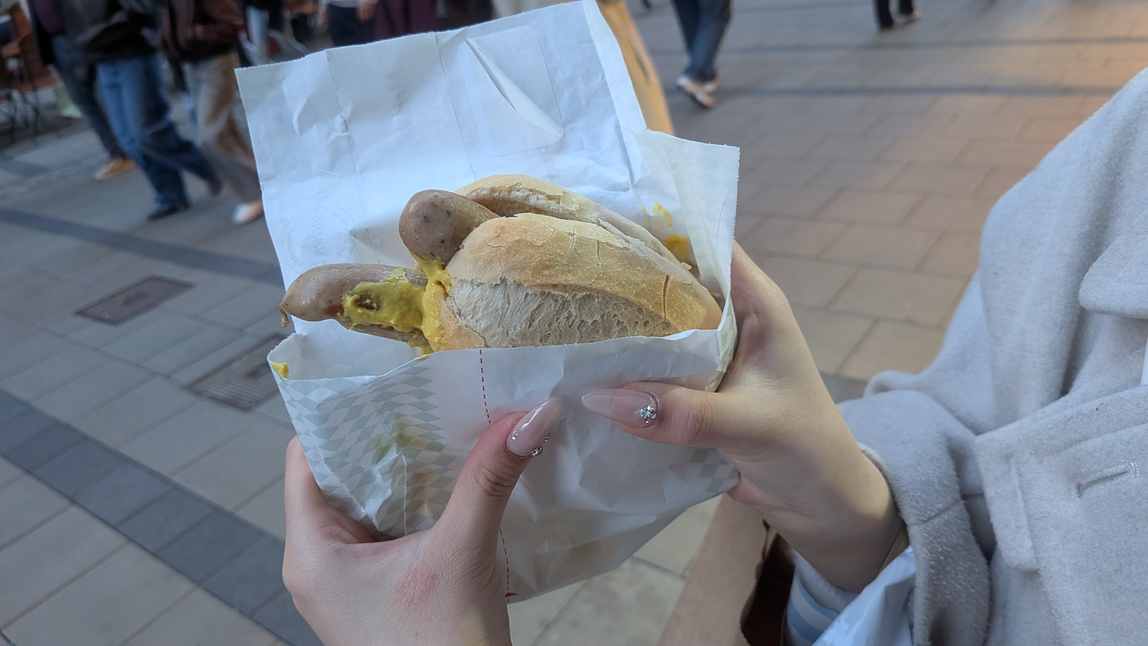 お土産とか買いたいので散策.早速道沿いのソーセージ屋が美味しそうだったので白ソーセージのサンドを購入.うまい.