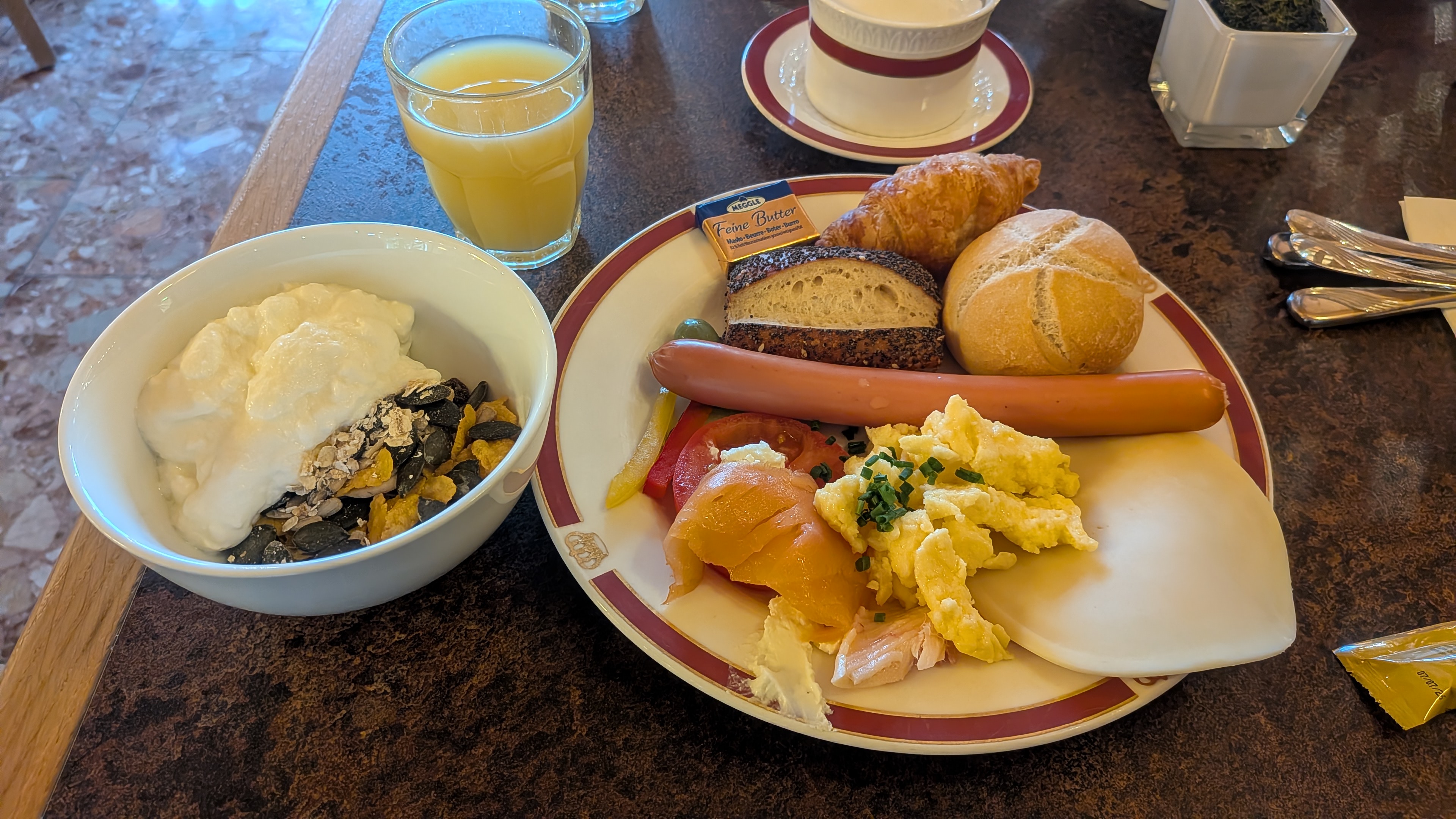パンは小さいもの数種類と,包丁で切るタイプのものがあった.その横にきゅうり,トマト,ピクルス,5種類くらいのハムと5種類くらいのチーズがあった.サンドイッチを作るためのセットなのかもしれない.あとはソーセージとスクランブルエッグ,ヨーグルトにグラノーラとかとにかくたくさんあって充実して食べ過ぎた.ジュースはリンゴとオレンジ,あとエスプレッソマシンでコーヒーとかを飲めた.