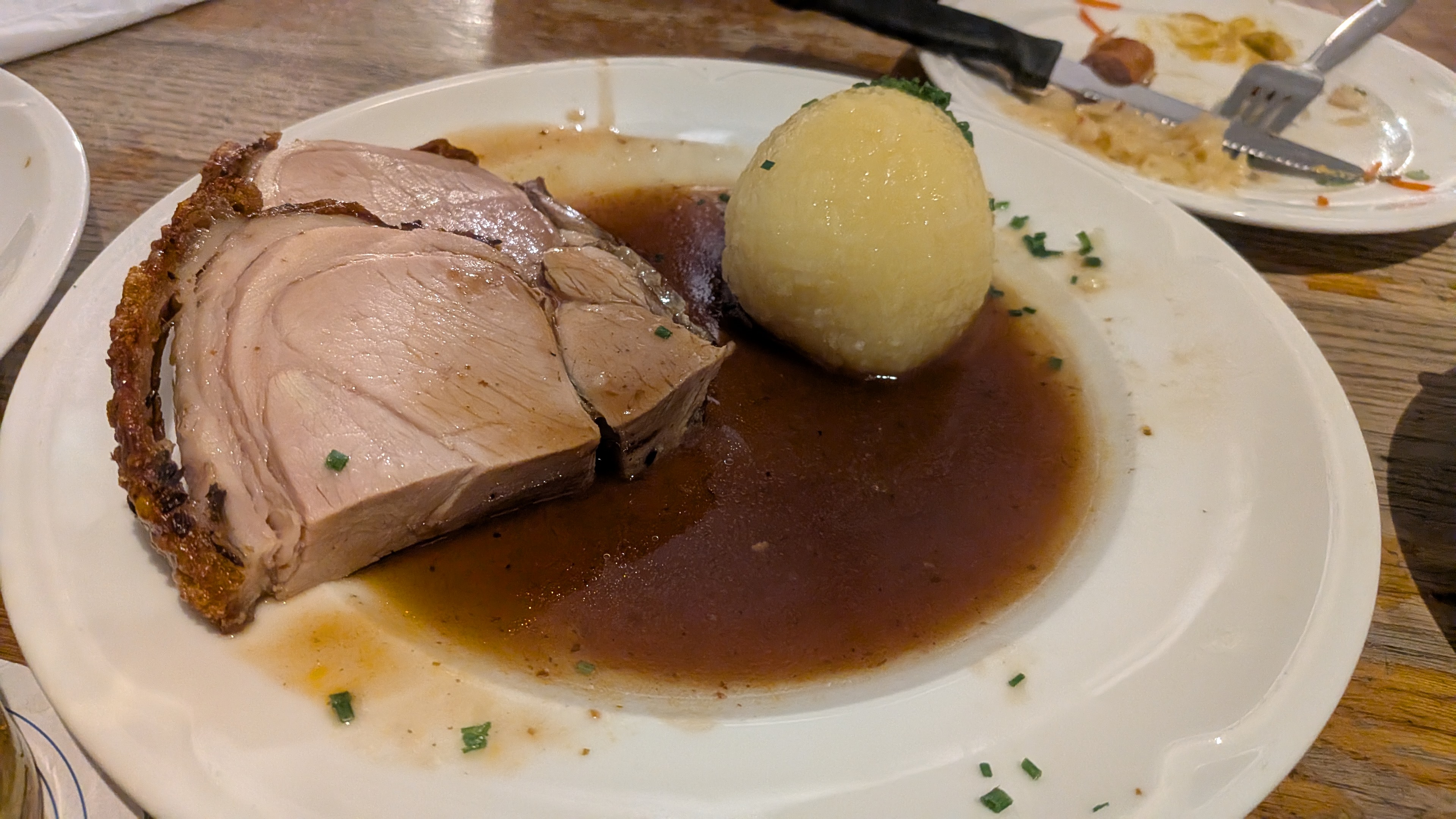 前日のシュバインスハクセが重かったですが今日はこれでは物足りないのでもう一品.もう一度シュバインスハクセと悩みましたが,今日はKrustenschweinebratenにしました.英語メニューではクリスピーローストポークと書いてましたね.これがまた美味しい.厚切りで食べ応えがすごいある.