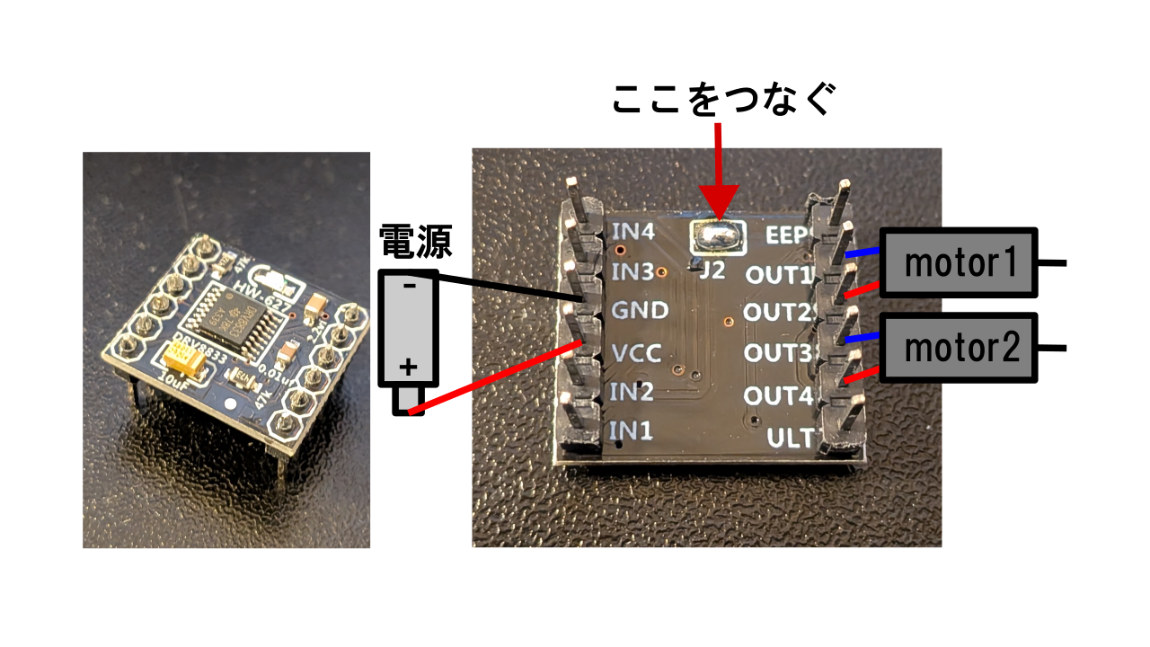 DRV8833には黒と赤がある。この辺の比較や解説はたまねぎブログさんのほうにありましたのでご参考までに。今回は黒を使用した。このように、電源をモータードライバーにつなぎ、IN1, 2に指令を入れることでmotor 1を、IN3, 4に指令を入れることでmotor 2を駆動できる。今回は、正転しか使用しないため、IN1とIN3しか使用していないが2や4を使用することで逆転させることも可能である。