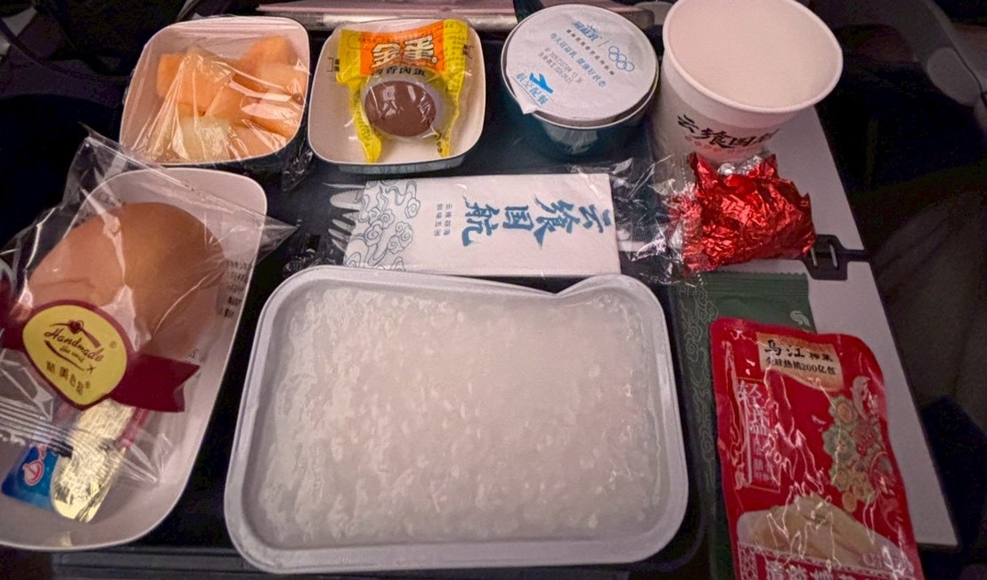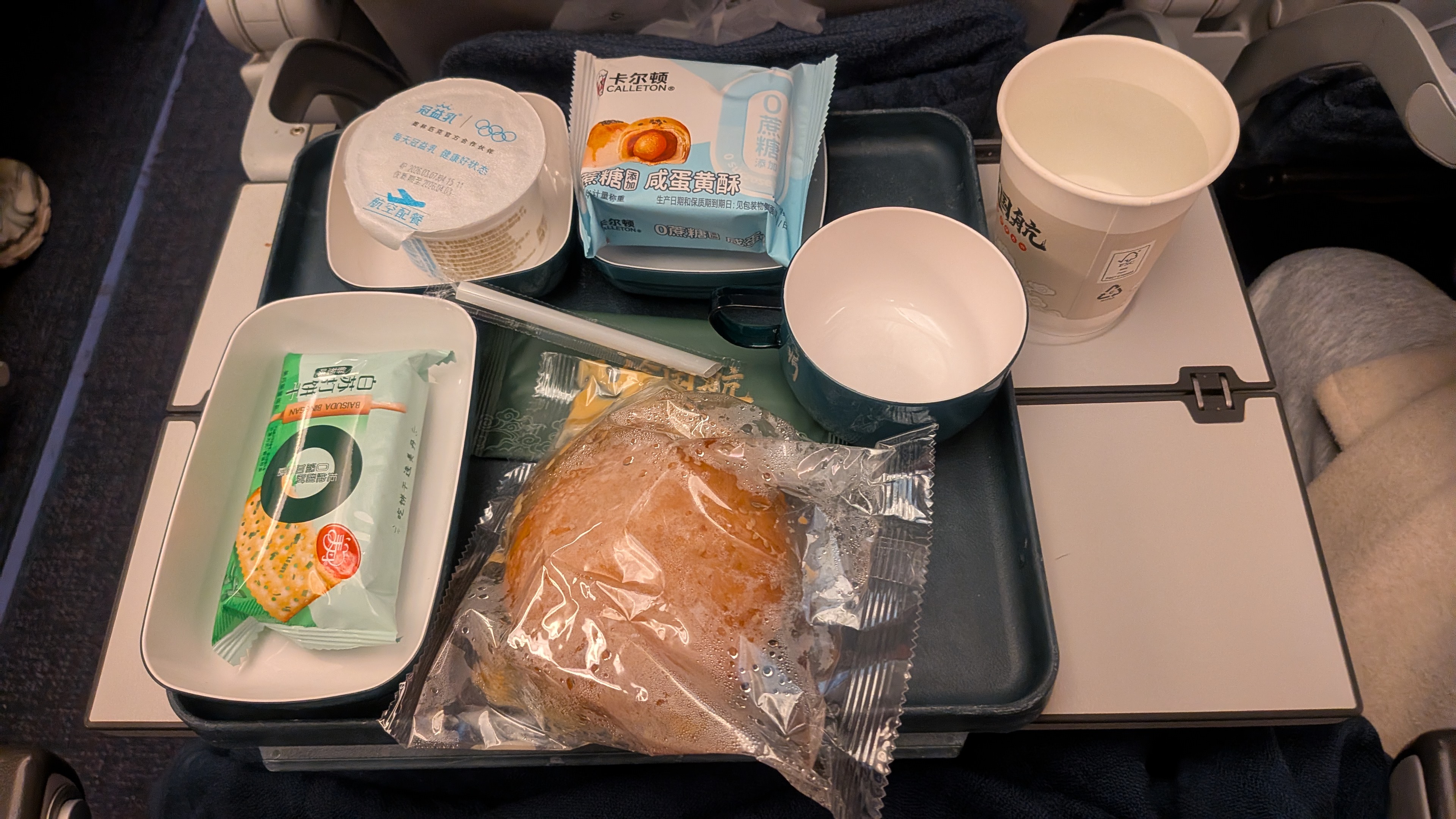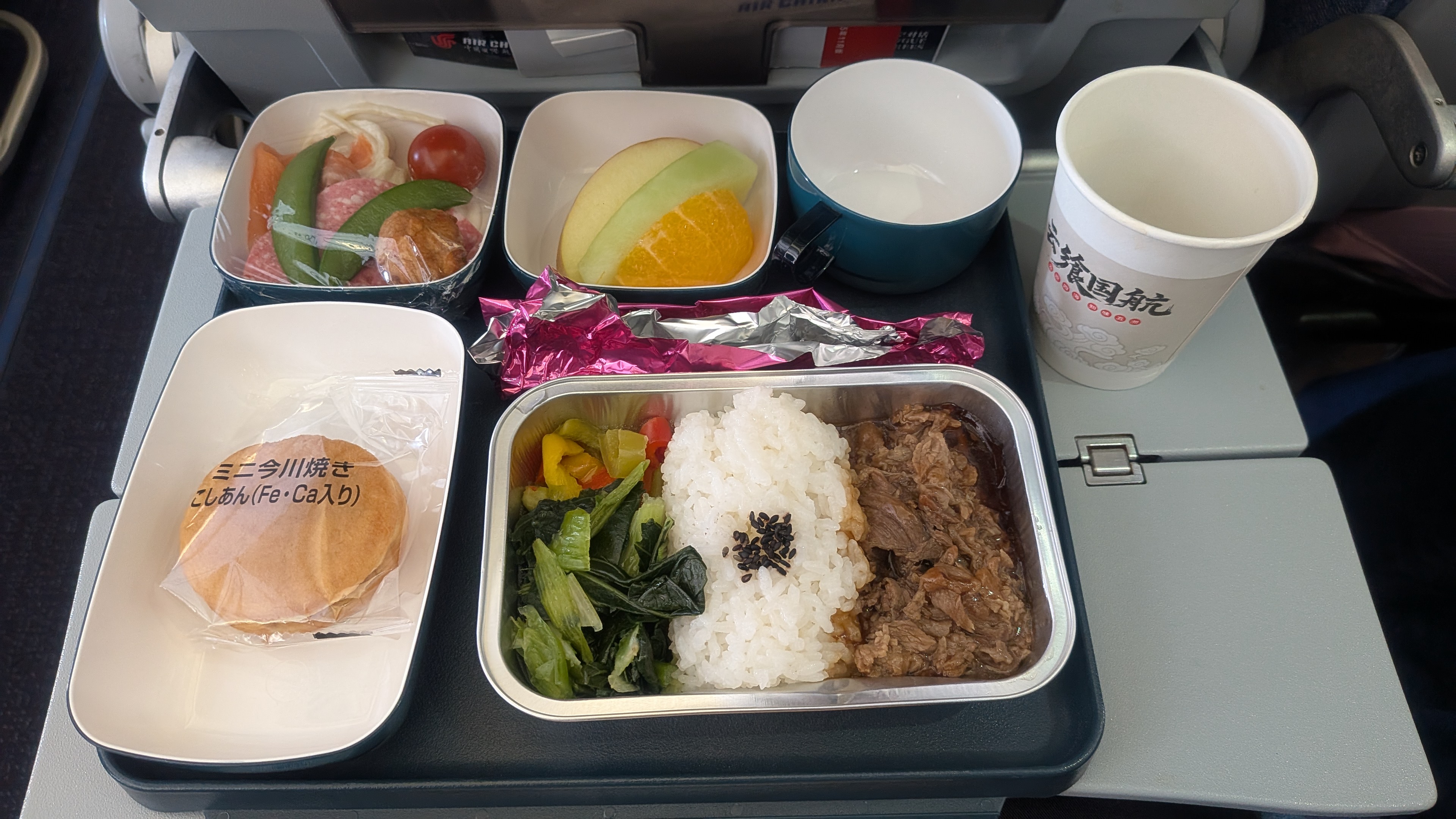 離陸からしばらくしてモンゴル上空付近で風が強いのか非常に機体が揺れたことを覚えています.ただ深夜なので皆さん眠っている中一度目の軽食です.温かいチキンパニーニかビーフハンバーガーの2択でした.これのどこが軽食なのか知りませんが実食.ハンバーガーはスーパーによくあるヤマザキのチーズバーガーのような味でした.嫌いではないです.そのほかのビスケットやまんじゅうはとにかくパサパサで口の中の水分がすべて無くなるような食べ物でした.ただしょっちゅう飲み物の補給にくるのでそれに救われました.ちなみにこのときに寝ていると,付箋が机の前に貼られあとから貰えたりするようです.