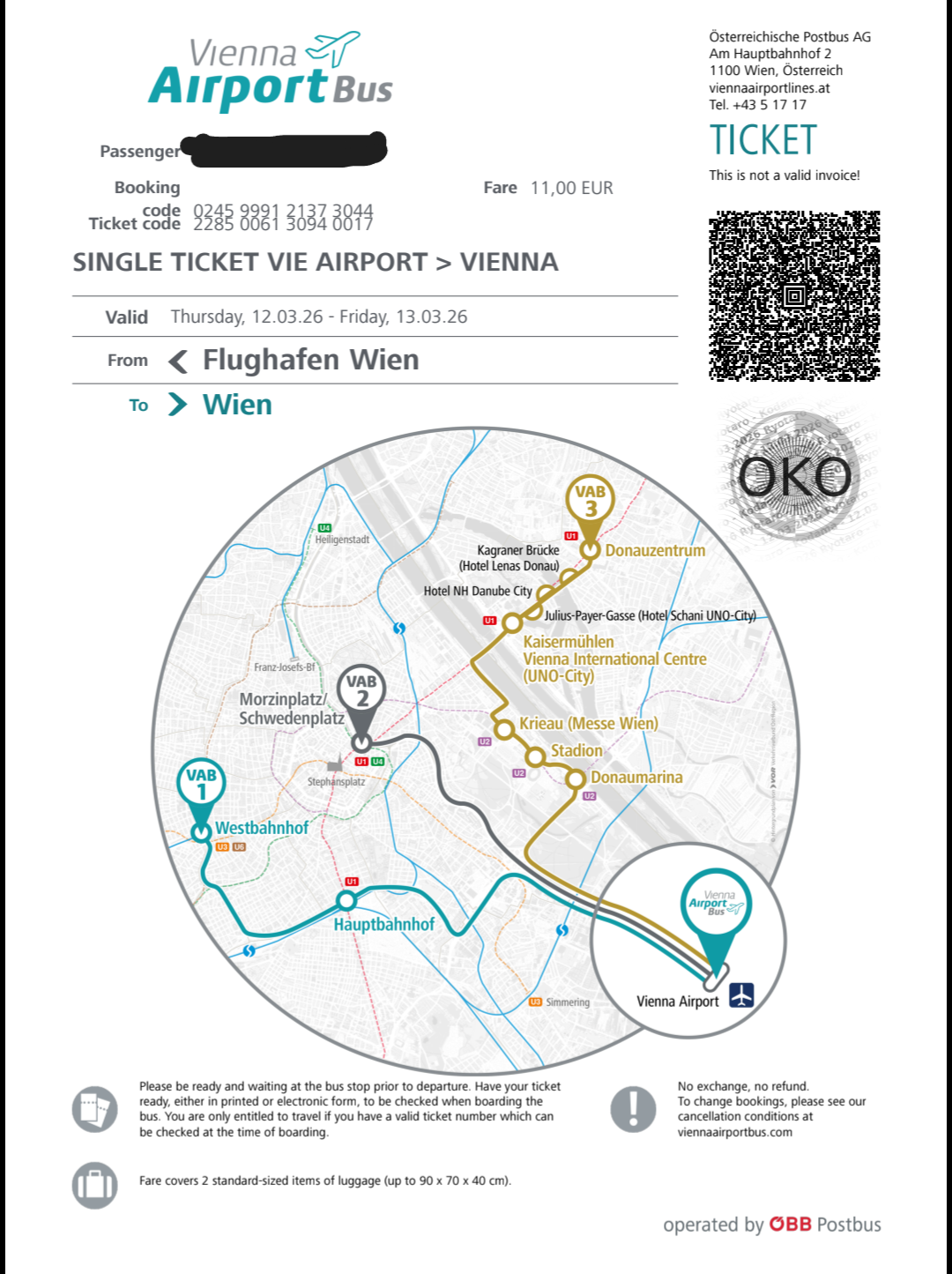 普通の旅行ならいまからウィーン旅行を始めるところですがどうしてか私たちはミュンヘンへ電車旅が始まります.まず空港から市街までは電車で15分,バスで30分程度ということでしたが目的地がウィーン西駅(Westbahnhof)でしたので便利なVienna Airport busで移動しました.バスは片道10ユーロ,往復で19ユーロですので帰る日が決まっている方は往復で買うほうが便利です.チケットはオンラインで購入でき以下のようなものでQRコードを見せれば乗り込めました.路線は3種あり,どれも同じ料金です.VAB1はウィーン中央駅と西駅,VAB2は旧市街,シュテファン大聖堂のあたりに向かうものでした.