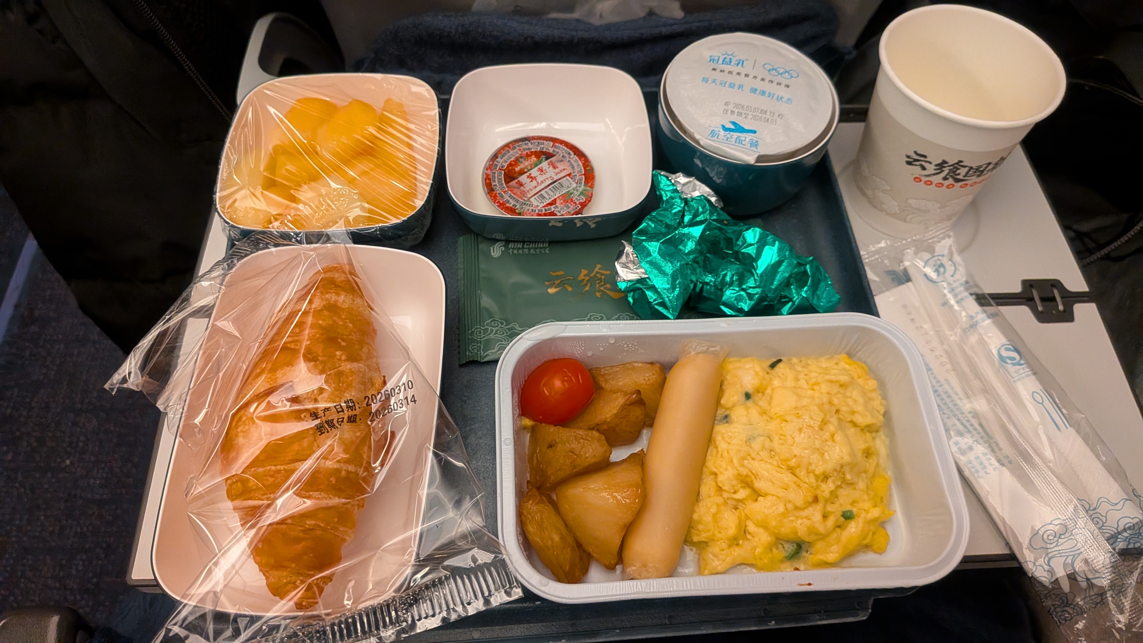 二度目の機内食はモスクワのあたりかな?到着の前にアナウンスがありました.正直,ずっと誰かが横を通って,飲み物とかのやり取りがあるのでろくに眠れませんでした笑.二回目の食事はウエスタンかチャイニーズかの2択でした,これが結構曲者です!私はソーセージがあると聞いて洋食に,tsukichanは中華を選びました.