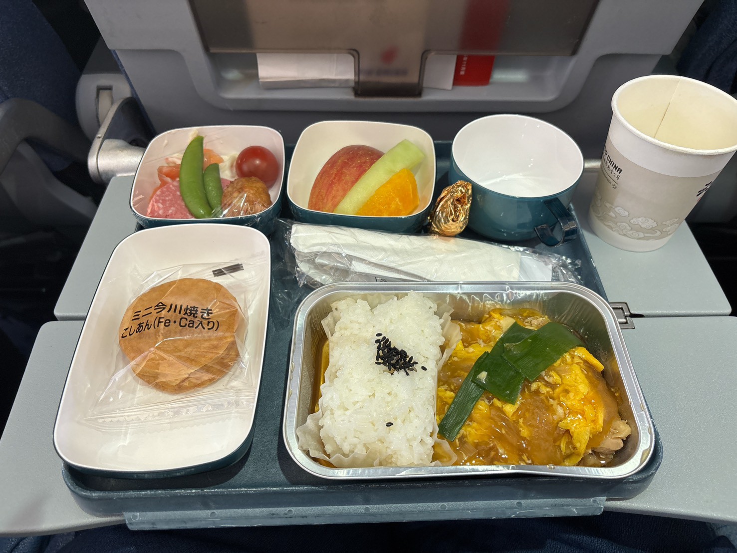 緊張の国際線,A330に乗り込みました.古い設備の機体ですが清潔で全席に枕とブランケットがありました.搭乗したらなんと機内食があるではないですか!!何を急いでラーメンを食べてダッシュで搭乗したんだ,そうしなくていいように機内食があるんですね・・・反省しました..機内食は二種類.親子丼と牛丼のようなもの.どっちも美味しかったです.