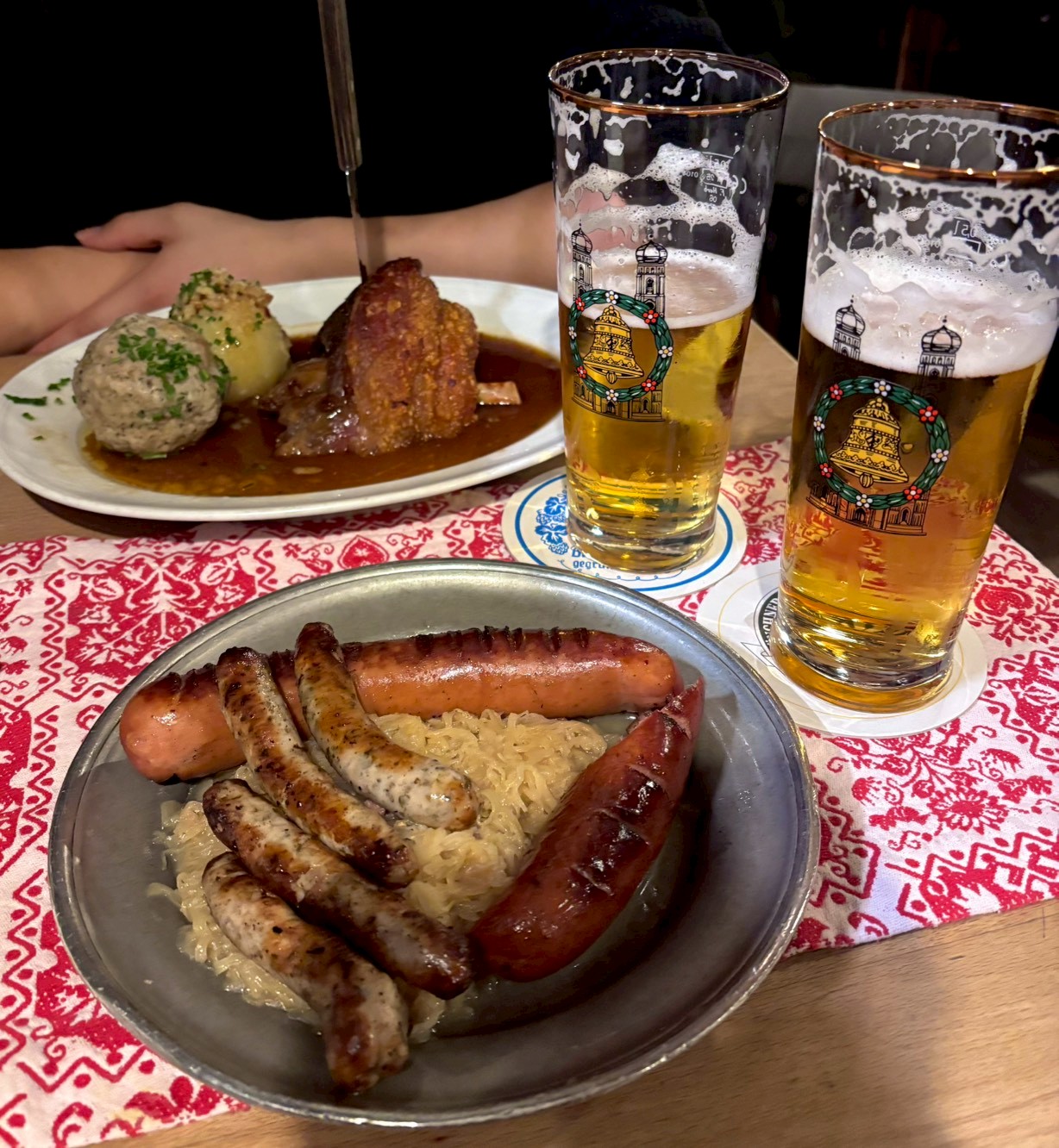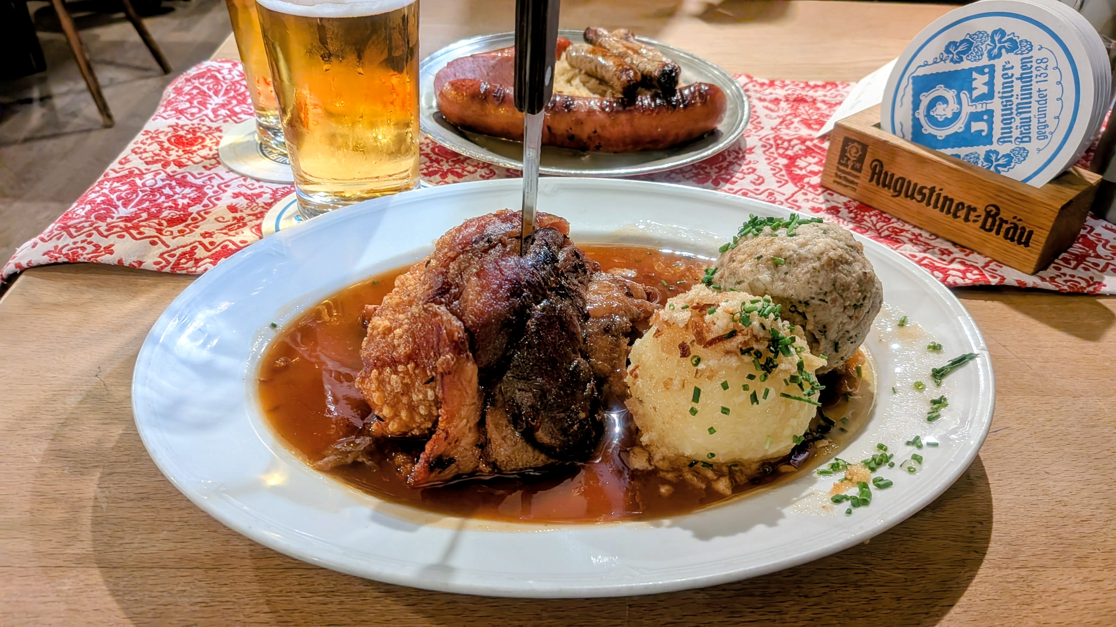 この肉を見てほしい.なんですかこれ.目の前に拳骨よりでかい肉の塊にナイフが刺さってて目を疑った.写真の倍の迫力がある.シュバインスハクセ(schweinshaxe)ぜひ覚えてほしい,うますぎる.トロットロなのに角煮のような重さがない.豚のすね肉をビールで煮込んでそのあとオーブンで焼いてるんかな??美味しかった.