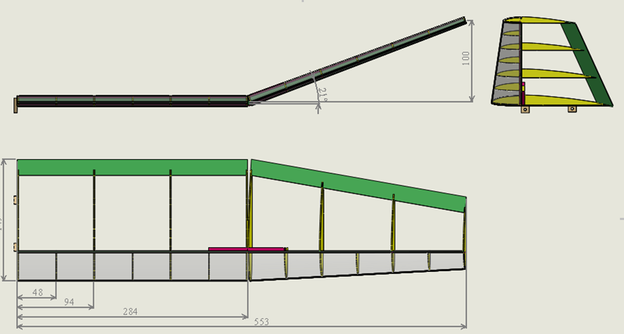 翼平面はこんな形です.後退角や前進角,ねじり下げはなく,途中上反角20度を設けました.上反角は翼根からと仮定すると13度に相当するようにしました.